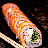 (10 makis) Langostino tempura, aguacate y queso crema. Cubierto con ajonjolí.