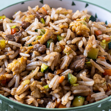 Arroz blanco cocido, huevo, cebolla larga, zanahoria, arvejas, pollo o carne, salteado en salsa de soya y aceite vegetal.