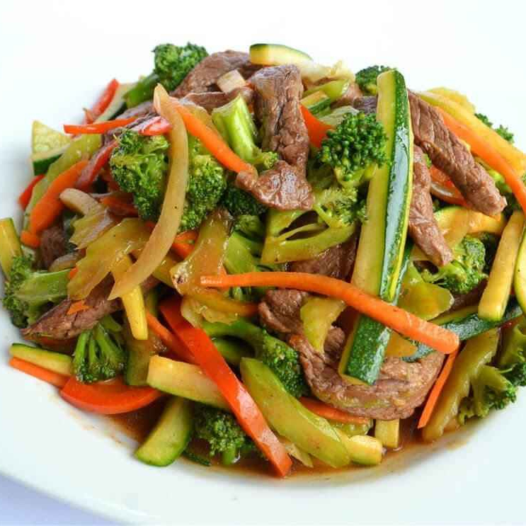 Trocitos de pollo o carne, repollo, zanahoria, cebolla, apio, salsa de soya, salteado en aceite.