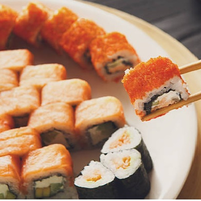 (10 makis) Kanikama, aguacate y queso crema. Cubierto con masago.