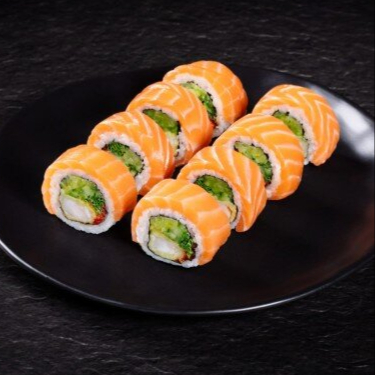 (10 makis) Salmón fresco, aguacate y queso crema. Cubierto con ajonjolí.