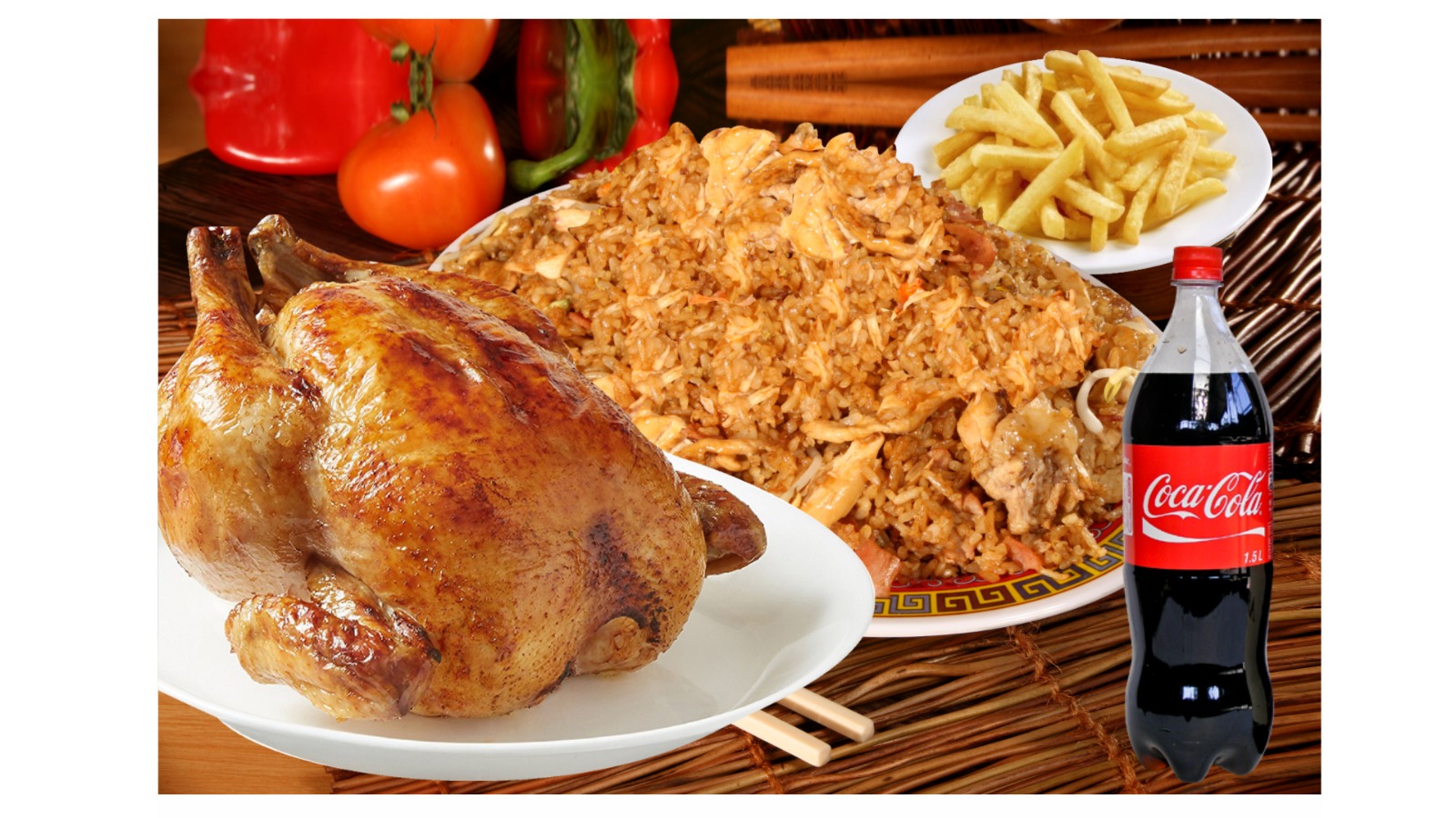 Combo familiar (1 pollo frito, una porción de papas a la francesa y una porción de arroz y una porción de arroz chino tradicional, una gaseosa 1.5 L).