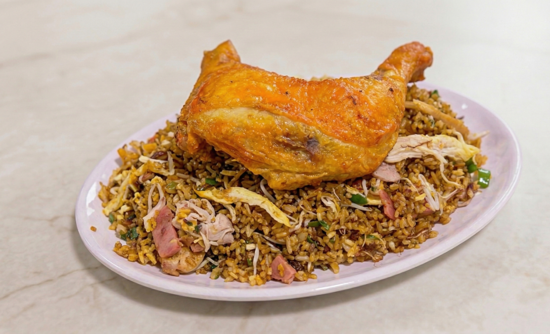 1/4 Pollo frito (pierna pernil), arroz con carne de cerdo, pollo desmenuzado y jamón de pollo).