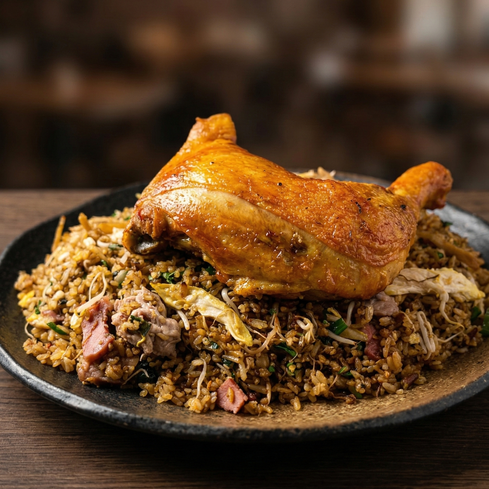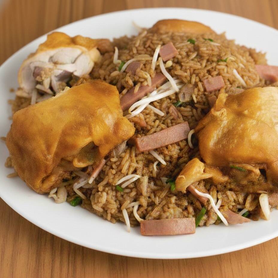 Medio pollo frito, arroz con carne de cerdo, pollo desmenuzado y jamón de pollo).
