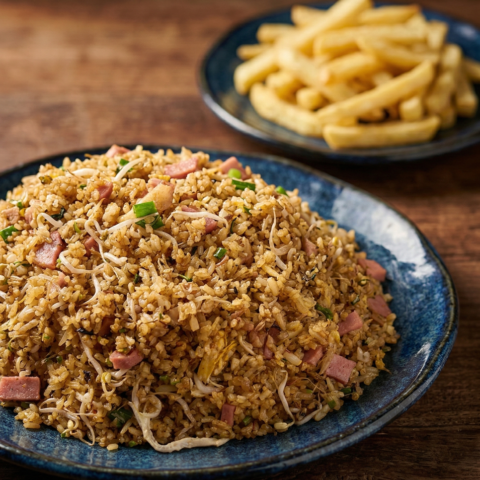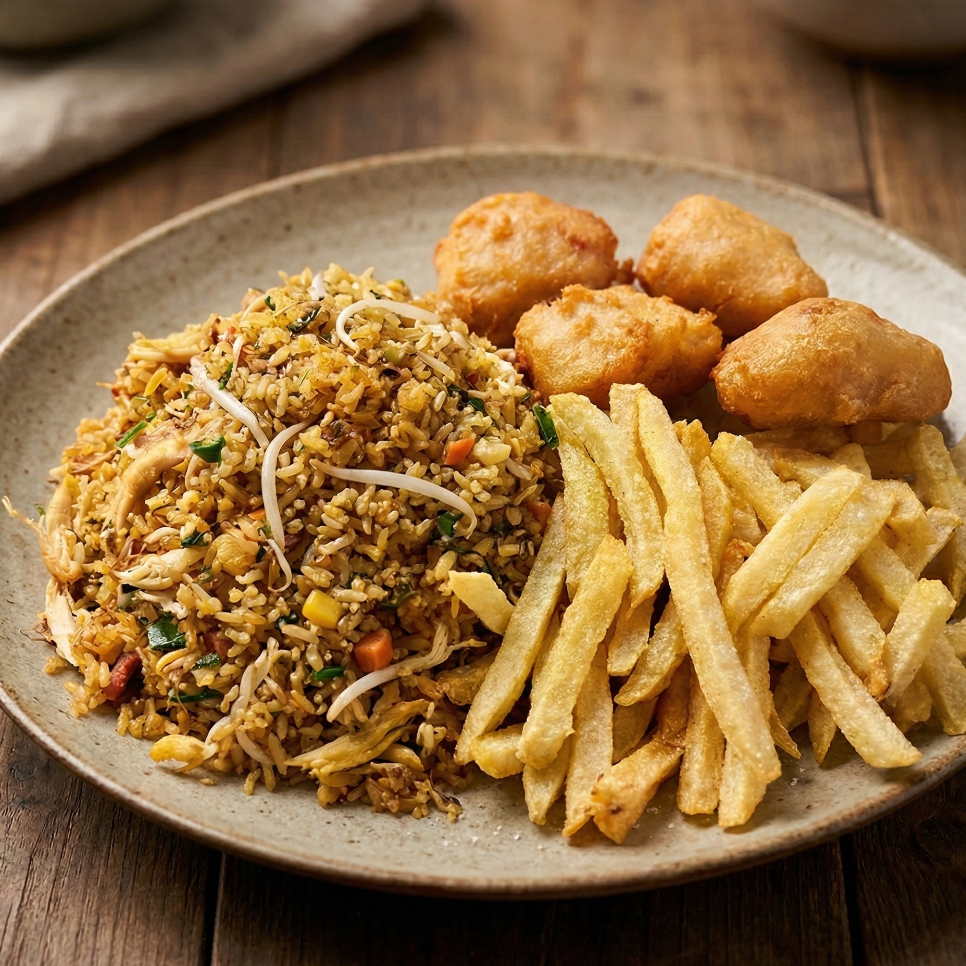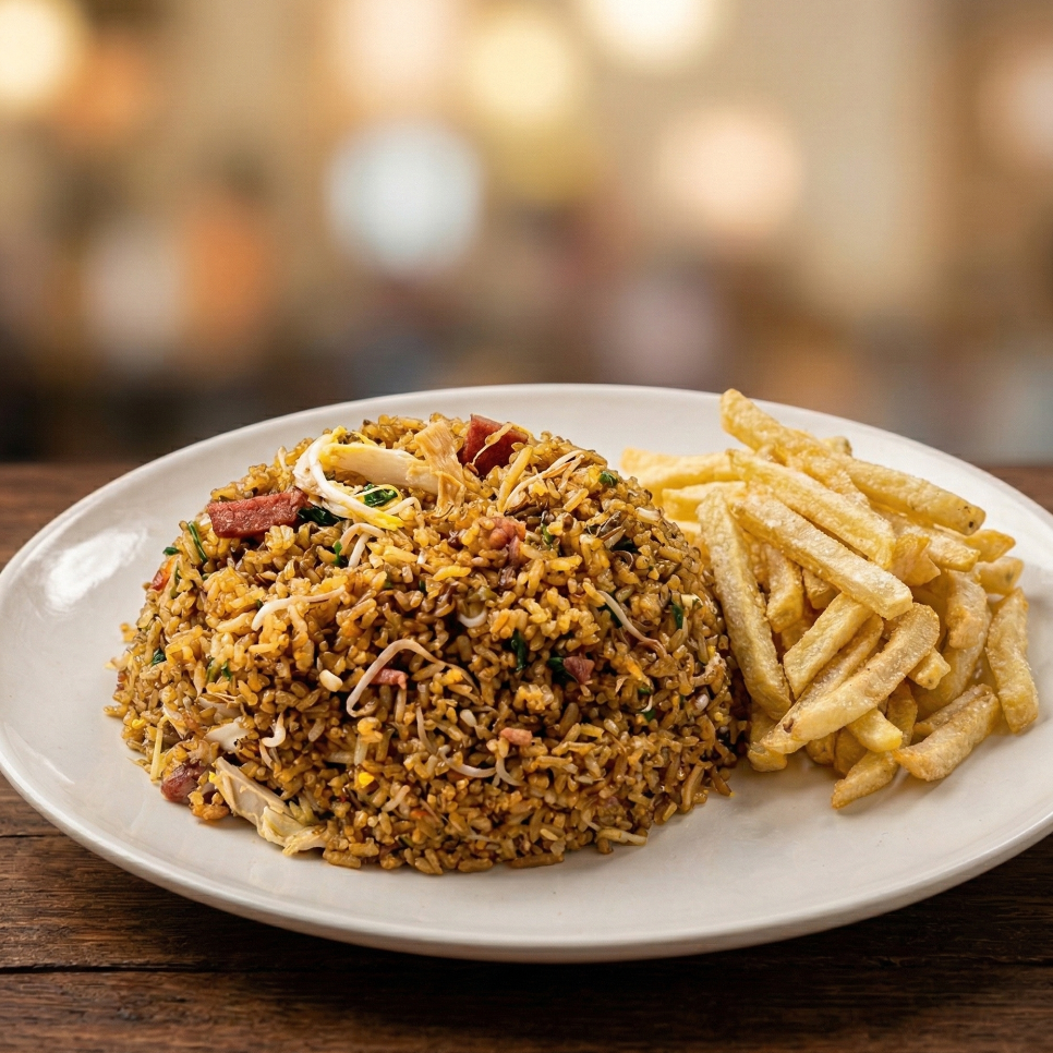 nuestro delicioso arroz con carne de cerdo, pollo desmenuzado, jamón y raíces chinas acompañado de deliciosas papas a la francesa en porción personal.