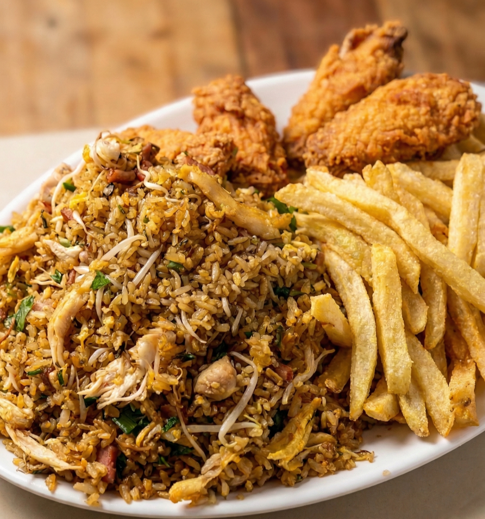 Nuestro delicioso arroz con carne de cerdo, pollo desmenuzado, jamón y raíces chinas con tres alitas acompañado de deliciosas papas a la francesa en porción personal.