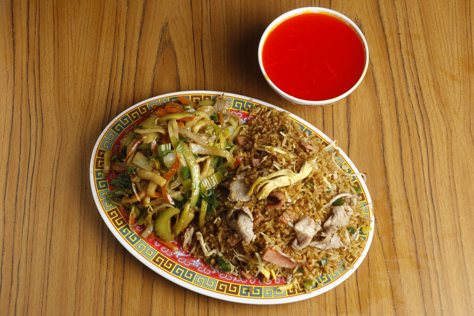 Arroz chino, verdura caliente, pollo y cerdo, camarón, 3 trocitos de cerdo agridulce.