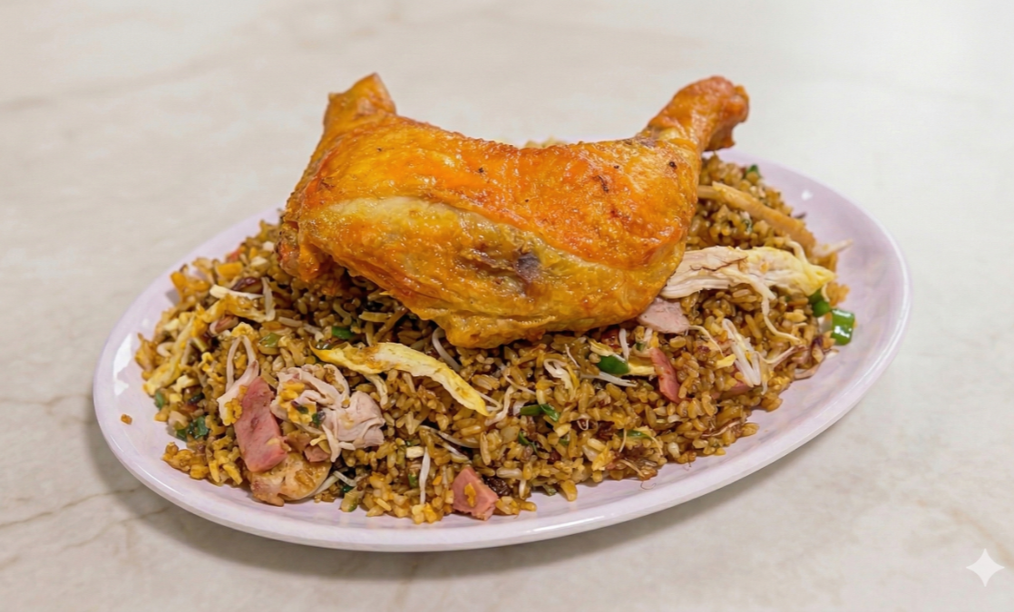Medio pollo frito (pierna pernil), arroz con carne de cerdo, pollo desmenuzado y jamón de pollo).
