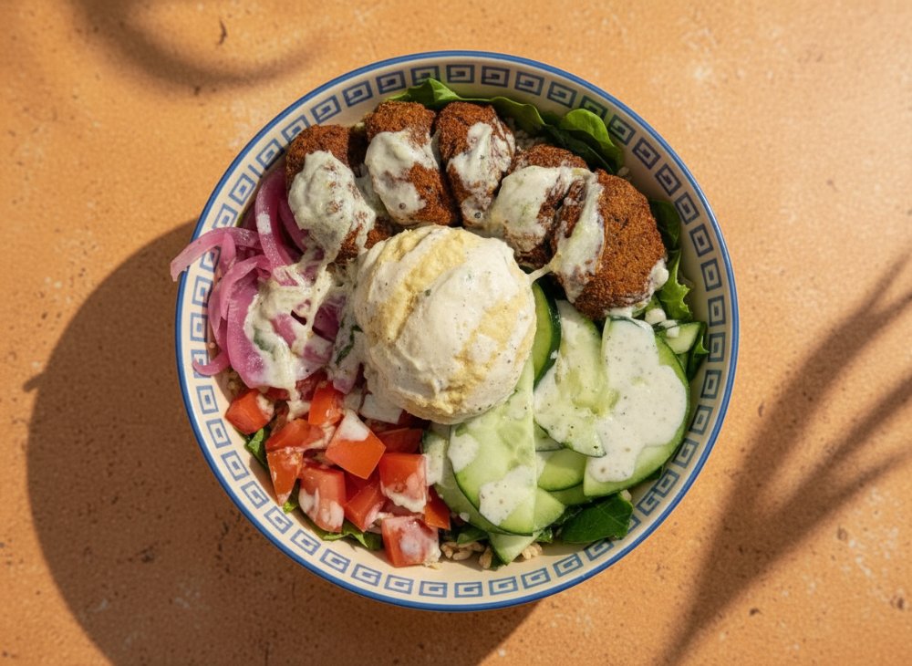Bowl de arroz integral con falafel, mix de lechugas, hummus de garbanzos, pepino cohombro, tomate y cebolla encurtida picante, terminado con vinagreta libanesa.