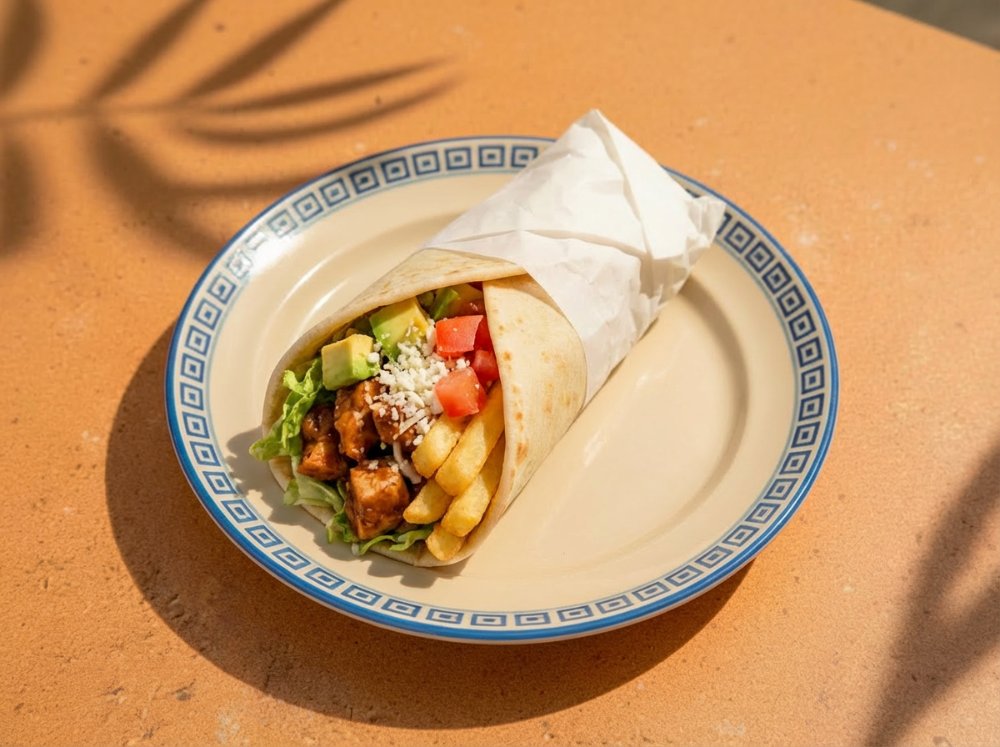 Pita rellena de pollo harissa, hummus de garbanzos, cogollo europeo, aguacate, tomate, queso feta y papas fritas.