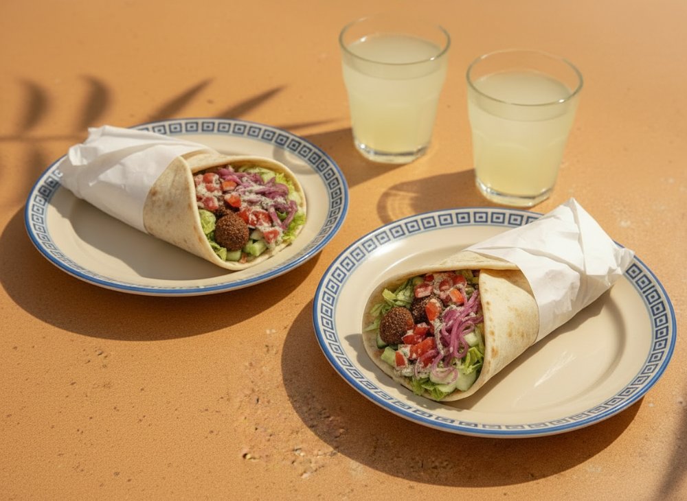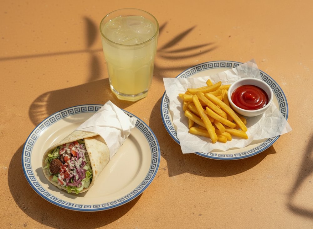 Pita de falafel con hummus y vegetales frescos, papas fritas sazonadas y bebida a elección.