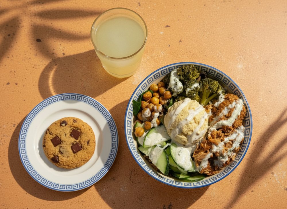 Combo bowl de cerdo braseado con arroz integral, vegetales, hummus y vinagreta libanesa. Incluye galleta chunks y limonada.