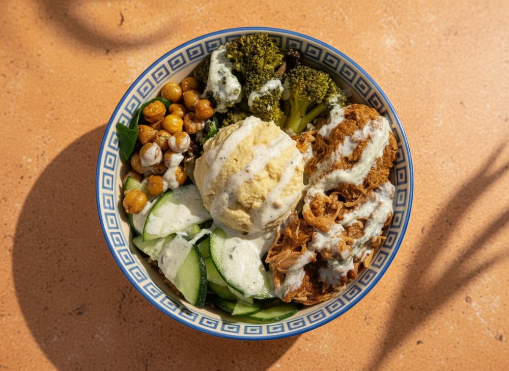 Bowl de arroz integral con cerdo Braseado, mix de lechugas, hummus de garbanzos, pepino cohombro, brócoli rostizado y garbanzos crocantes, terminado con vinagreta libanesa.