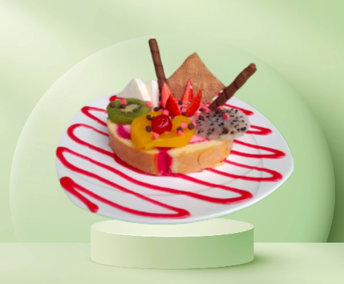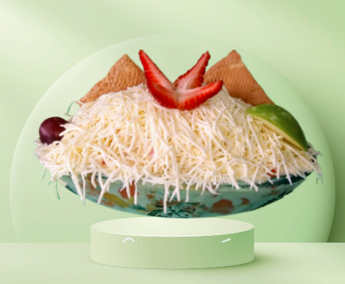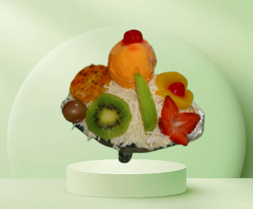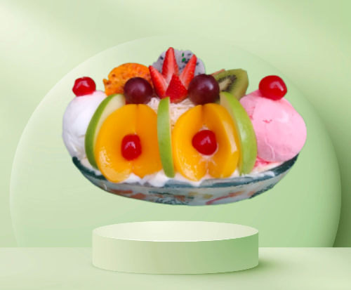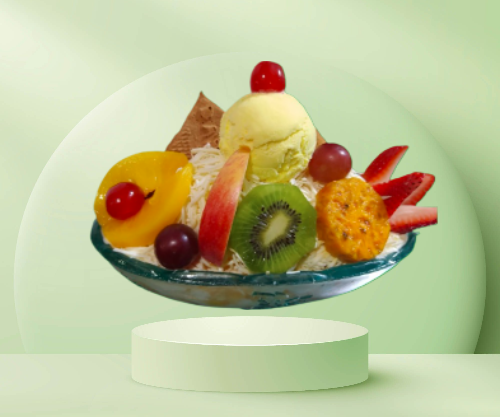 Papaya, melón, mango, banano con crema de leche, queso, durazno, fresa, kiwi, manzana, carambolo, acompañado de una porción de helado, fresas y galleta.