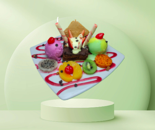 Esponjoso brownie, salsa de chocolate, acompañado de chantilly, dos porciones de helado chocolate y vainilla, barquillo y fresa.
