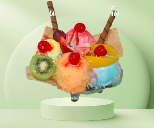 Rollo de helado, crema de leche, queso, durazno, kiwi, fresa, pitahaya, cereza, grajeas y barquillos.