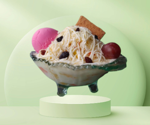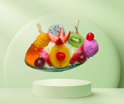 Papaya, banano, manzana, piña, mango, fresa, crema de leche, queso, kiwi, durazno, pitahaya, uva, cereza, arándano, porción de helado, melocotón y medio platillo de helado.gelatinay.