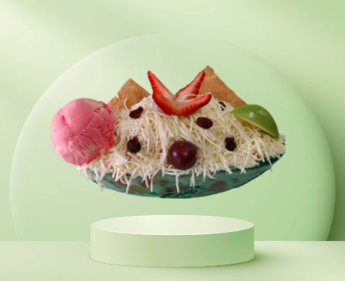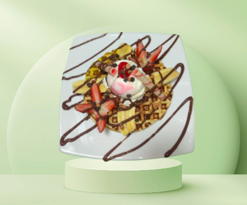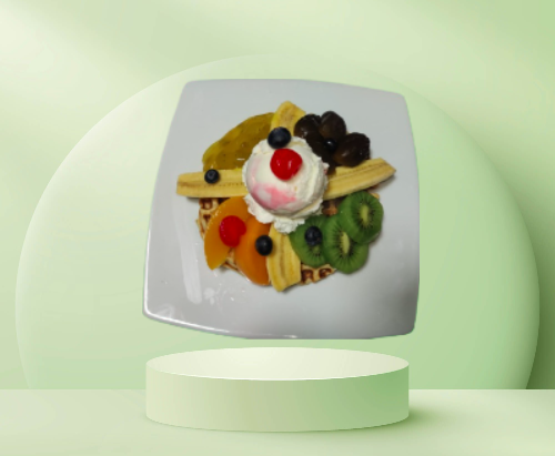 Tortilla de Waffle, fresas y banano picado, crema de leche, porción de helado, crema chantilly, barquillos, cerezas, durazno y kiwi.