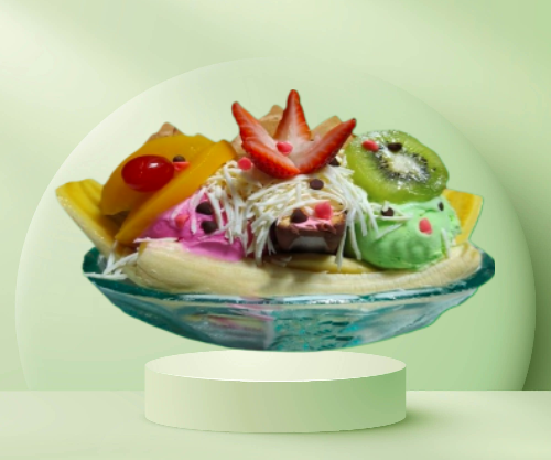 Banano, 2 bolas de helado, medio platillo de helado, crema de leche, queso, durazno, kiwi, fresa y cereza.
