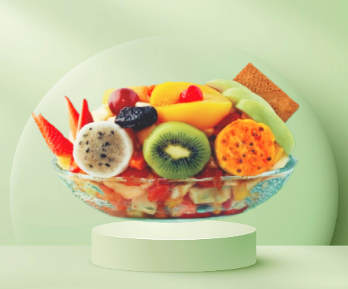 Papaya, banano, manzana, piña, mango, fresa, crema de leche, queso, kiwi, durazno, pitahaya, uva, cereza y medio platillo para una persona