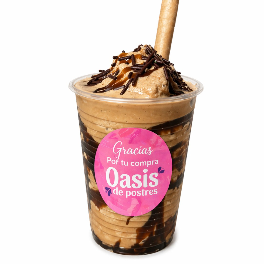 Cremoso capricho de café con helado, bañado en salsa de chocolate y leche condensada, coronado con crema de chantilly y deliciosos toppings. ¡Irresistible! ✨ Servido en vaso de 12 onzas