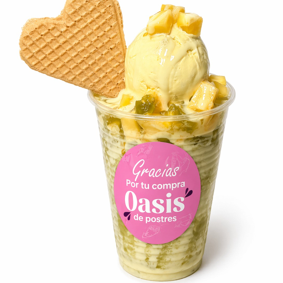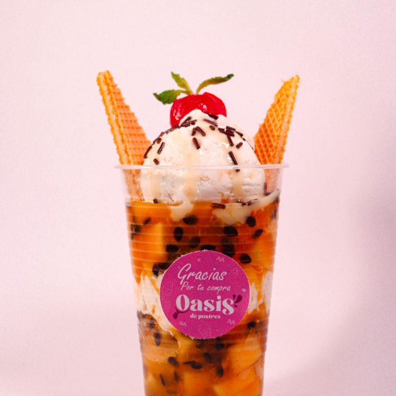 Mango, dulce de maracuya,chantilly,1 porción de helado, galleta wafers,cereza,leche condensada, chips de chocolate