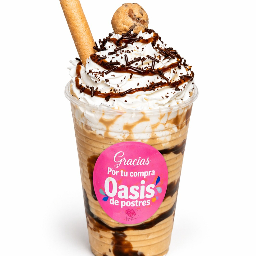 Refrescante frappe de café con leche, leche en polvo y hielo, bañado en salsa de chocolate y coronado con deliciosos toppings. ¡Frío y cremoso! ✨ Servido en vaso de 12 onzas