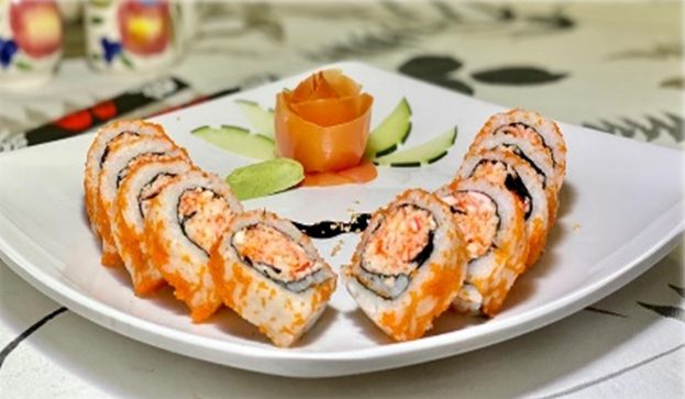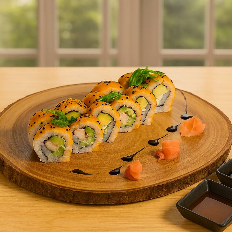 Langostinos tempurizados y aguacate. Topping: Queso crema, masago y maduro.