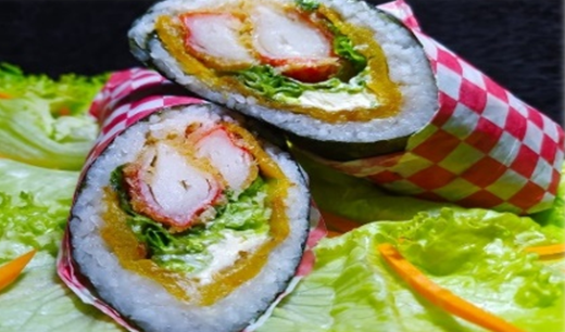 Nori, arroz, queso crema, basa tempura, cebolla larga, teriyaki.