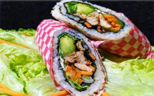 Arroz, nori, zanahoria, pollo teriyaki, aguacate, queso crema.