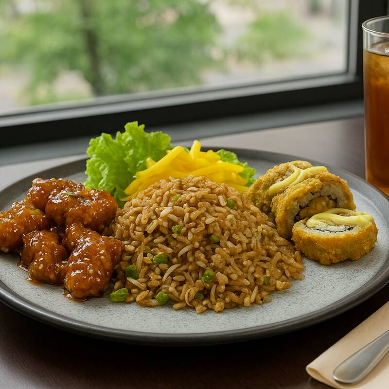 Pollo agridulce, arroz Yakimeshi, 3 piezas de sushi y coca cola