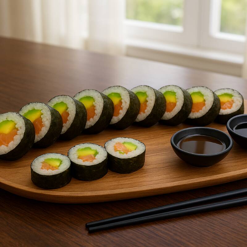 Nori, arroz, maduro, lechuga, queso crema, palmito tempurizado.