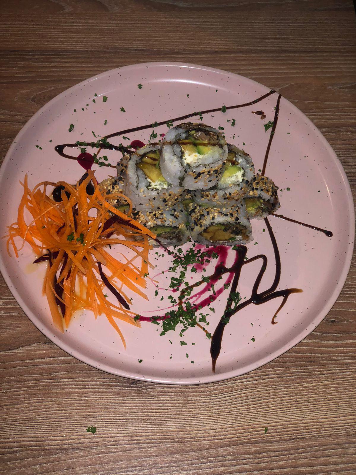 Alga nori, arroz, aguacate, Salmon fresco y queso crema.