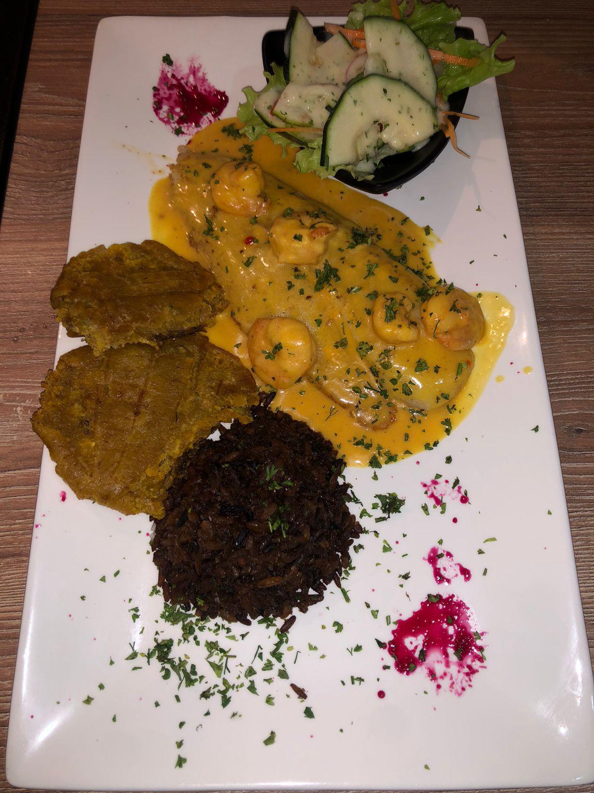 Acompañado de arroz, ensalada y patacón.