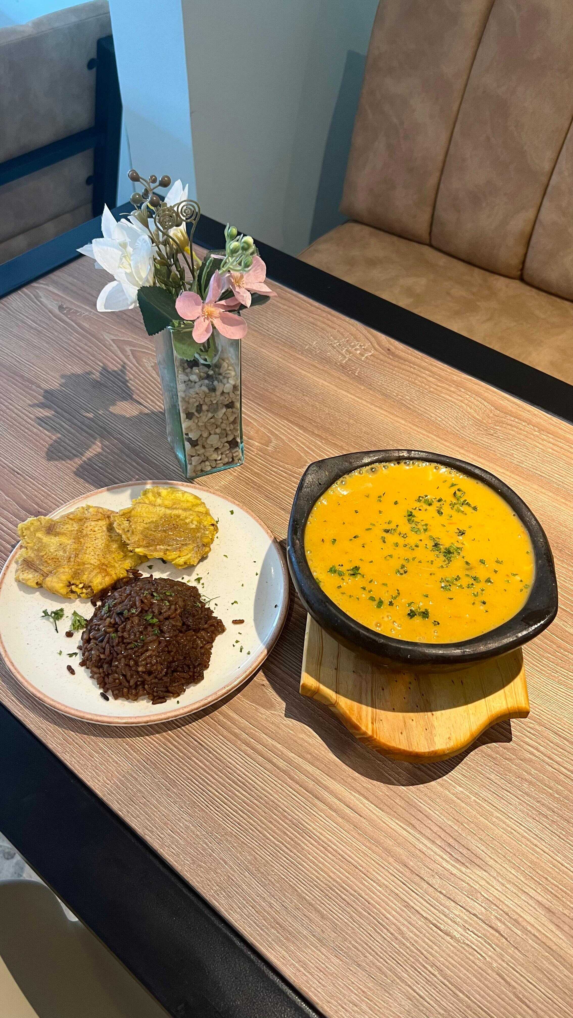 Deliciones Patacones con huevos revueltos bañados en hogao marinero acompañados de chocolate.