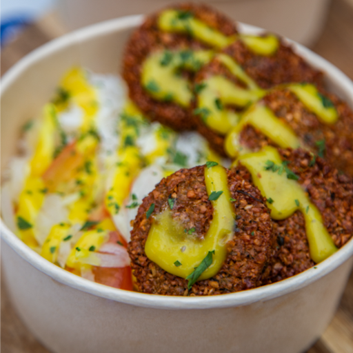 Pan o Tortilla, falafel, lechuga, tomate, cebolla, salsa blanca y salsa a elección.