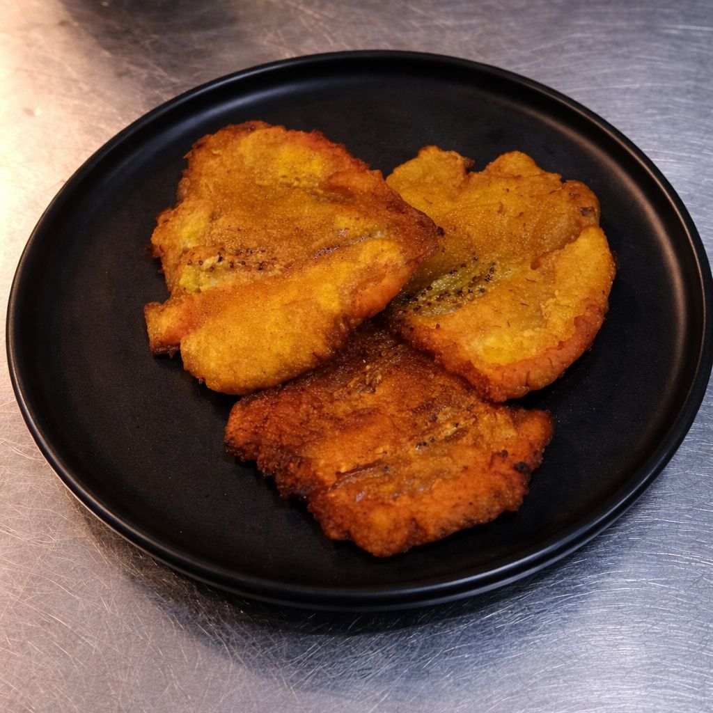 Jugosa carne de hamburguesa artesanal con queso gratinado, sobre ella un patacón maduro con queso sofrito y un chorícito santarrosano en salsa BBQ, todo esto en pan brioche y vegetales.