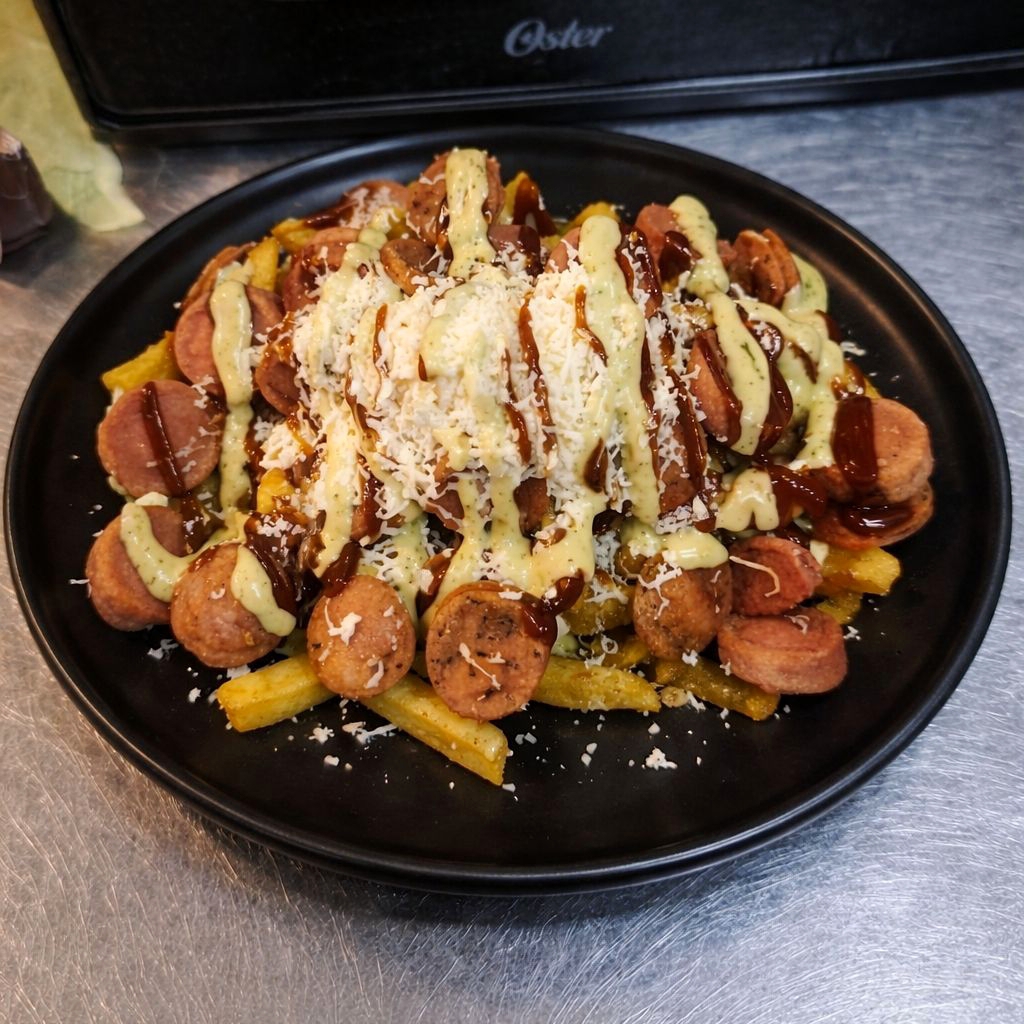Rica mezcla de pollo desmechado con maíz salsas de plancha y queso fundido sobre 300 g de papas francesas, salchicha tipo americana y salsa de la casa.