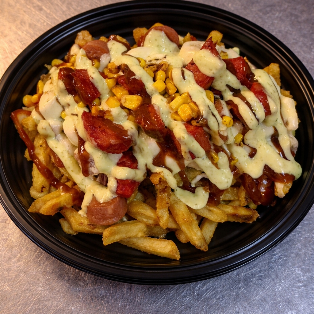 Jugosa combinación de carne desmechada en salsa de plancha, maíz dulce y queso fundido sobre 300 g de papas francesas, salchicha tipo americana y salsa de la casa.