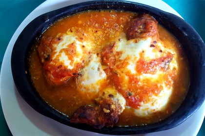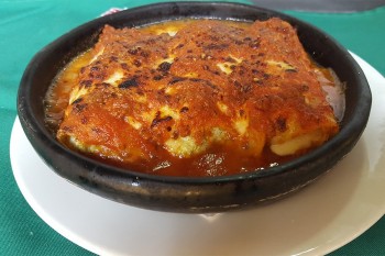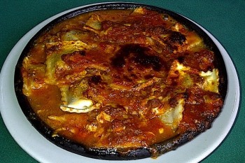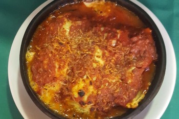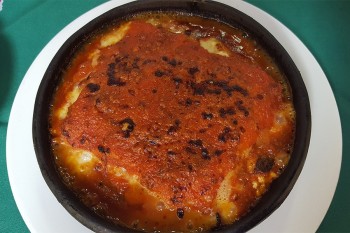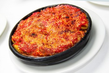 Ternera asada con queso y salsa napolitana al forno, acompañada de spaguetti napolitano.