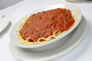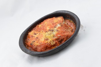 Ternera apanada cubierta con queso y salsa Ragú al forno, acompañada de spaguetti bolognés.