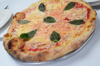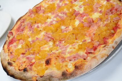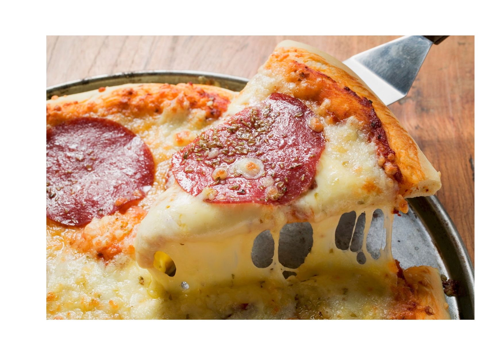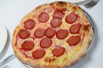 Cobertura de una pizza con tomate, queso mozzarella, peperonni, jamón, albahaca, preparado en horno de leña.