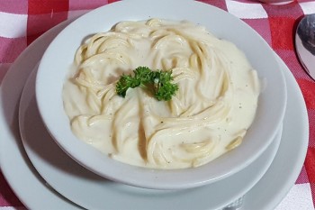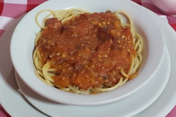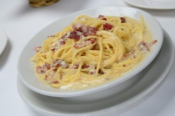 Salsa napolitana con cebolla picada, tocineta y vino blanco.