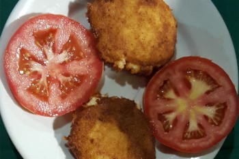 Rodajas de queso mozzarella apanado y frito, con tomate.