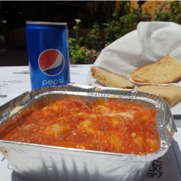 Gnocchi en salsa ragú preparado en horno de leña con coca cola sabor original 250 ml y pan de la casa