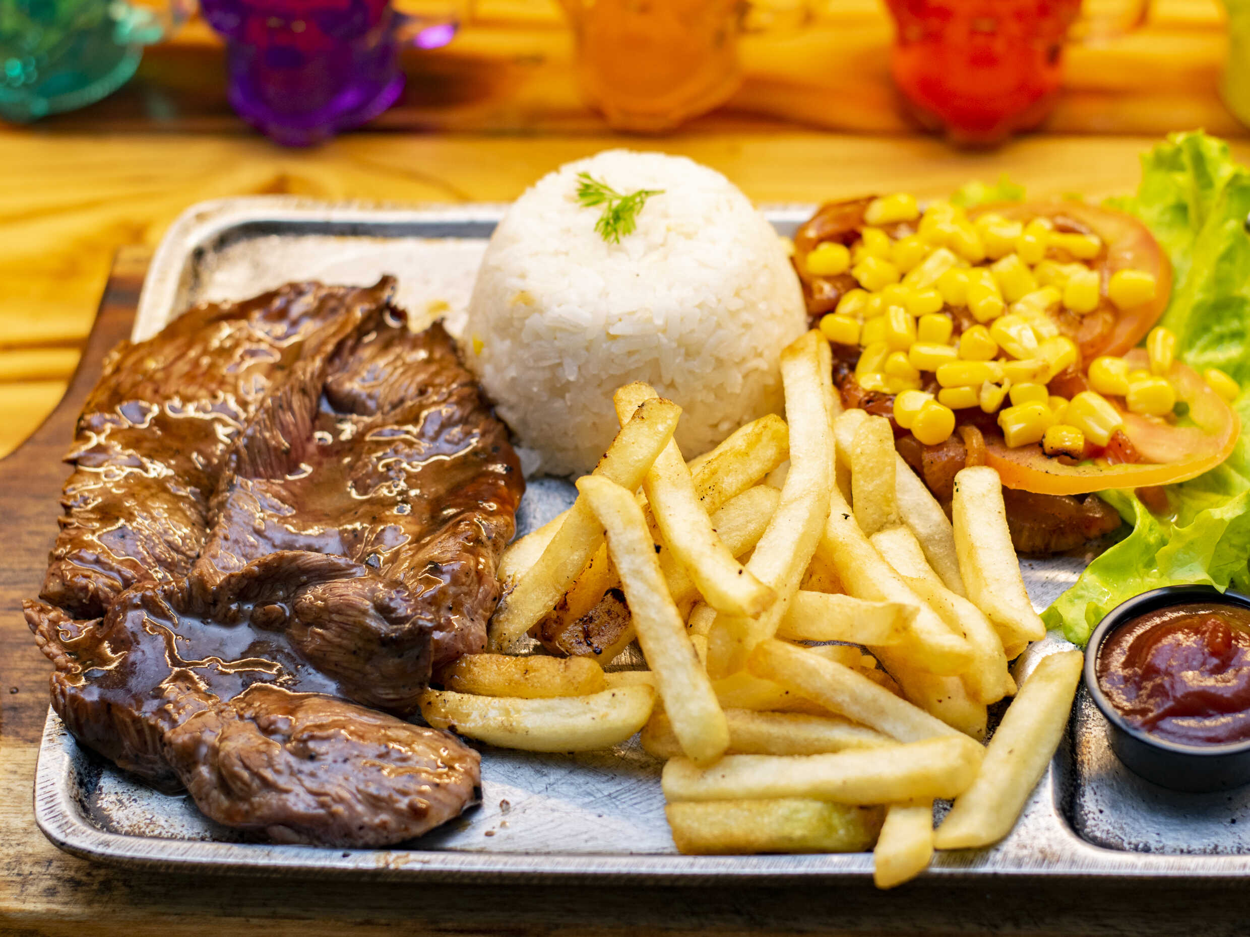 Arroz 150 g, pimentón, zanahoria, cebolla, huevo, mazorca desgranada, papa a la francesa.