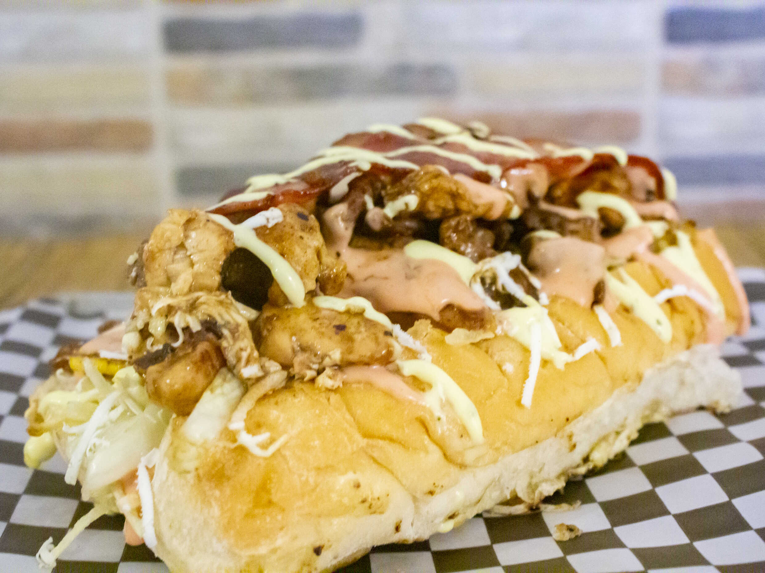 Pan artesanal, salchicha Zenú, tocineta, trocitos de carne, trocitos de pollo, papas chips, queso gratinado, salsas de mayonesa y tomate.
