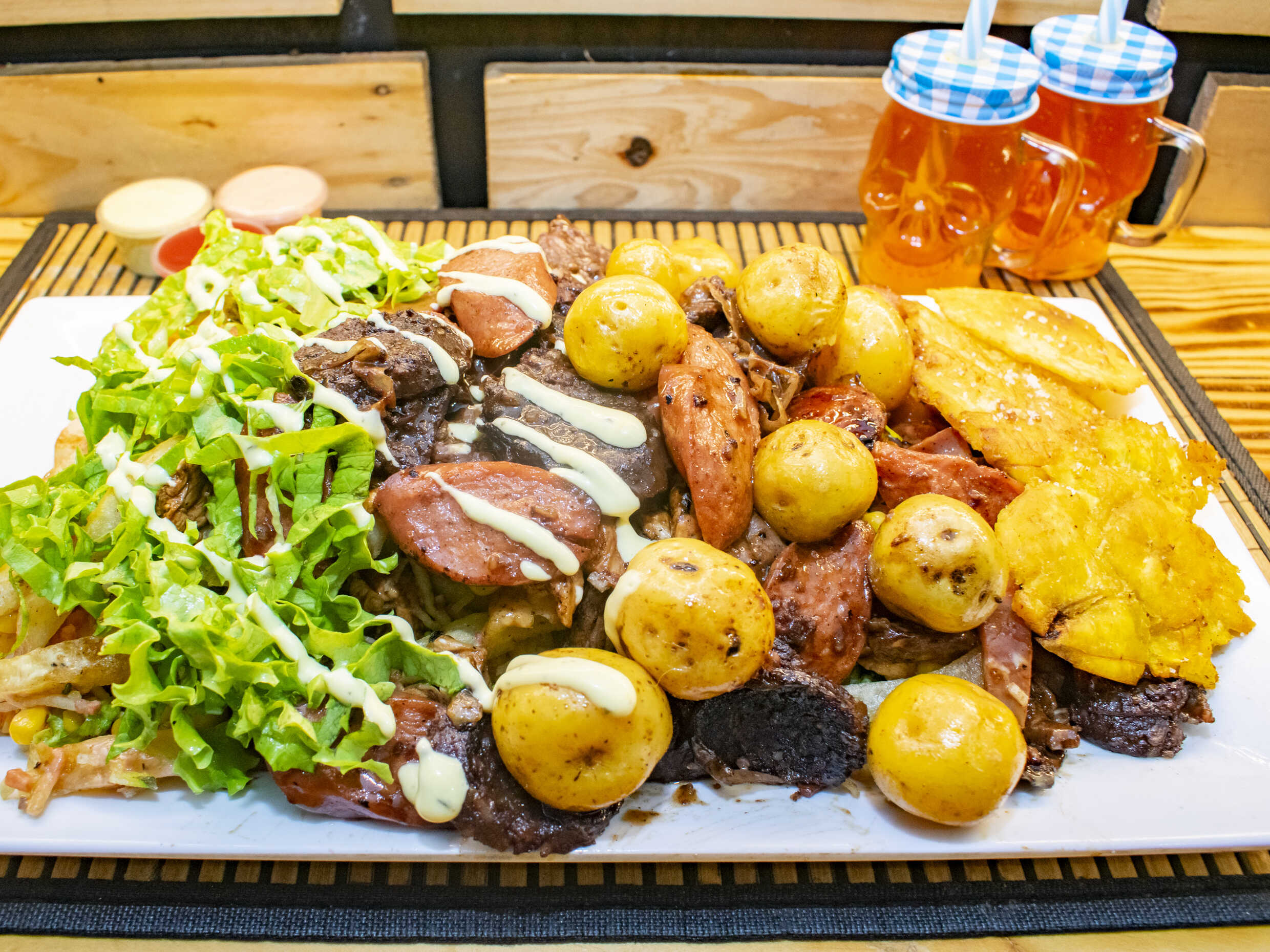 Papa criolla, salchicha americana, queso costeño, chorizo, morcilla, papa chip, lechuga lisa, salsas de la casa