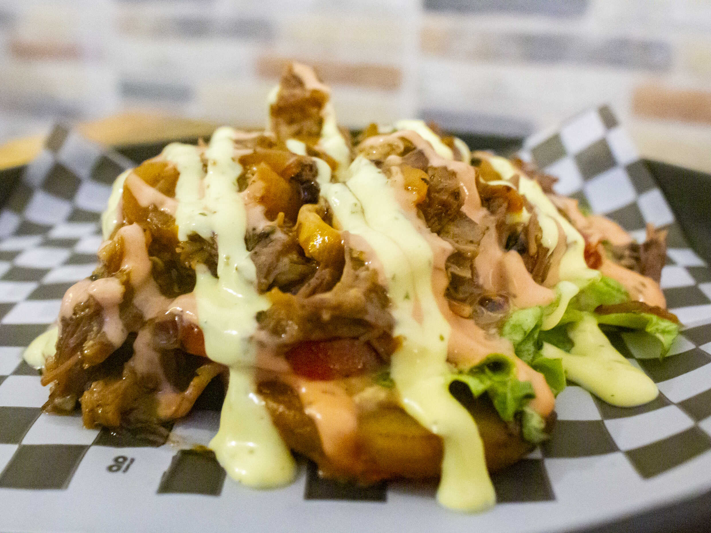 Patacón de 100 g, lechuga, tomate, carne desmechada y filete de pollo, queso gratinado, salsa de la casa, jamón, mazorca desgranada, o patacón.