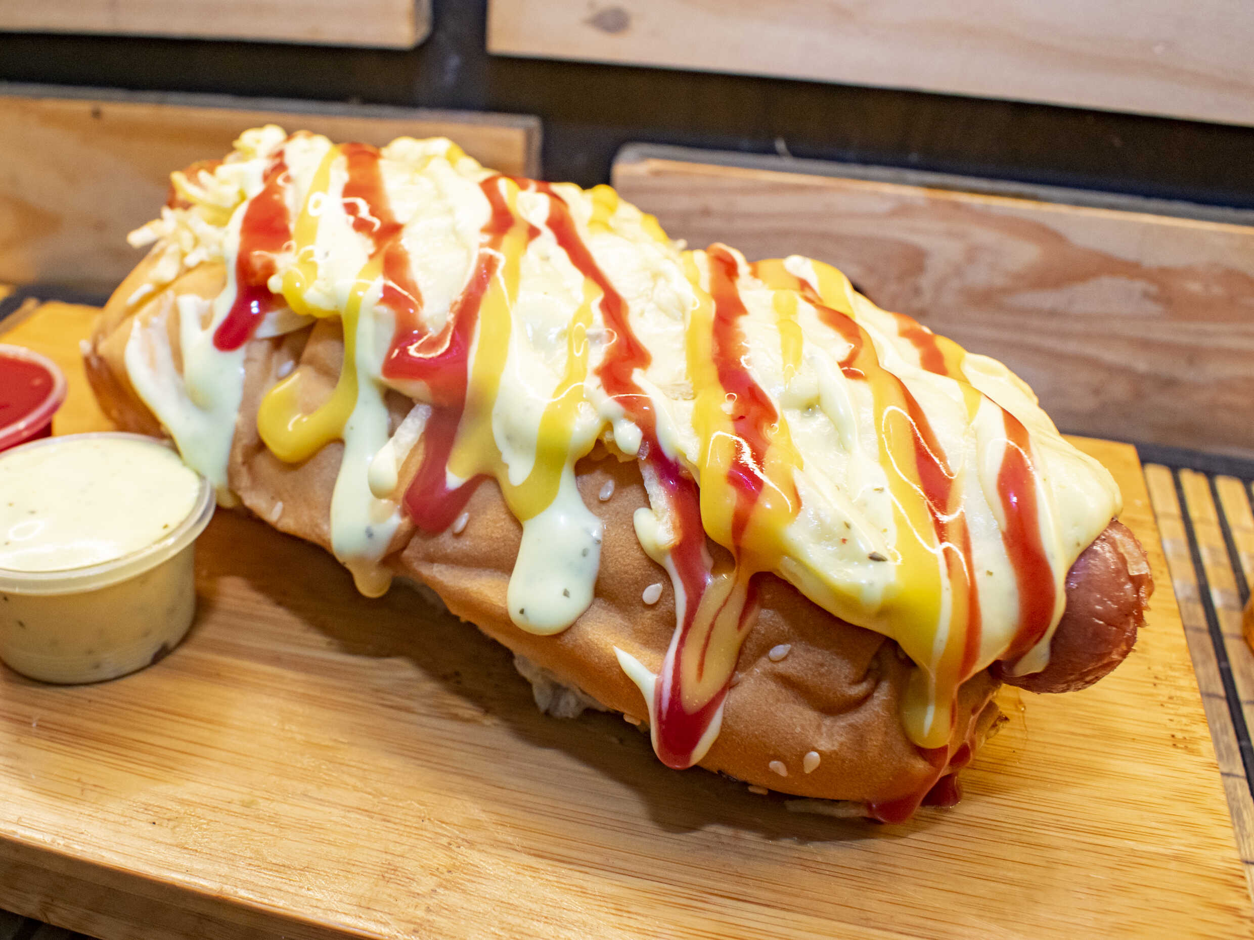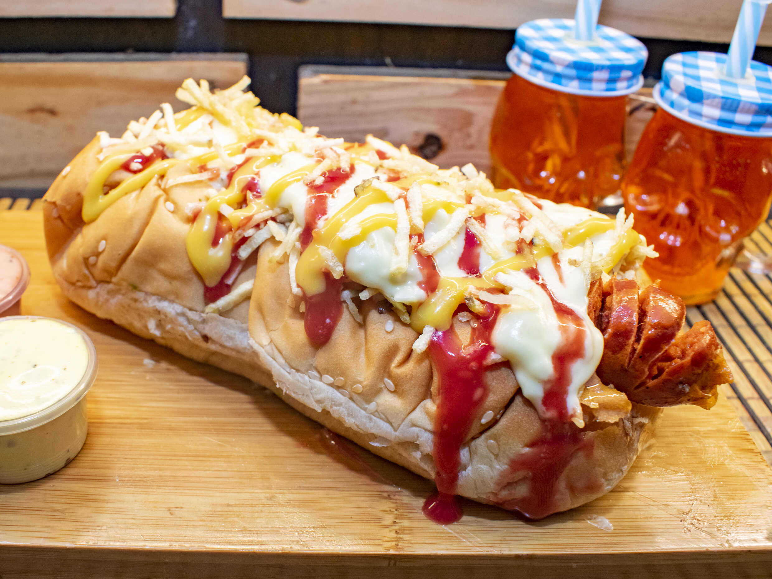Pan artesanal, salchichas Zenú, papas chips, queso gratinado, salsa de mayonesa y tomate.